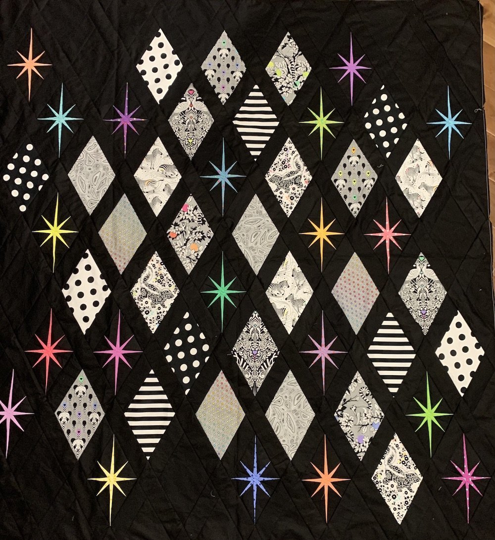 The Atomic Starburst quilt is made by combining foundation paper pieced Starburst blocks with traditional piecing for a vibrant, mid-century modern quilt.